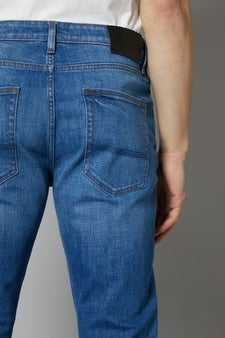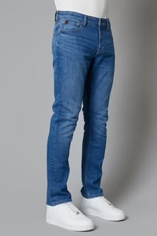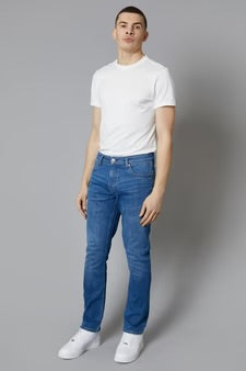 Designed with traditional five-pocket styling, a zip fly fastening, a regular rise, and a touch of stretch for a comfortable fit.