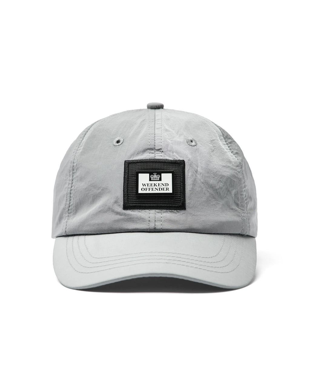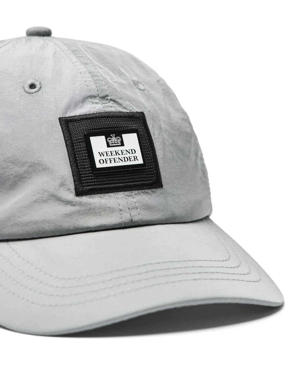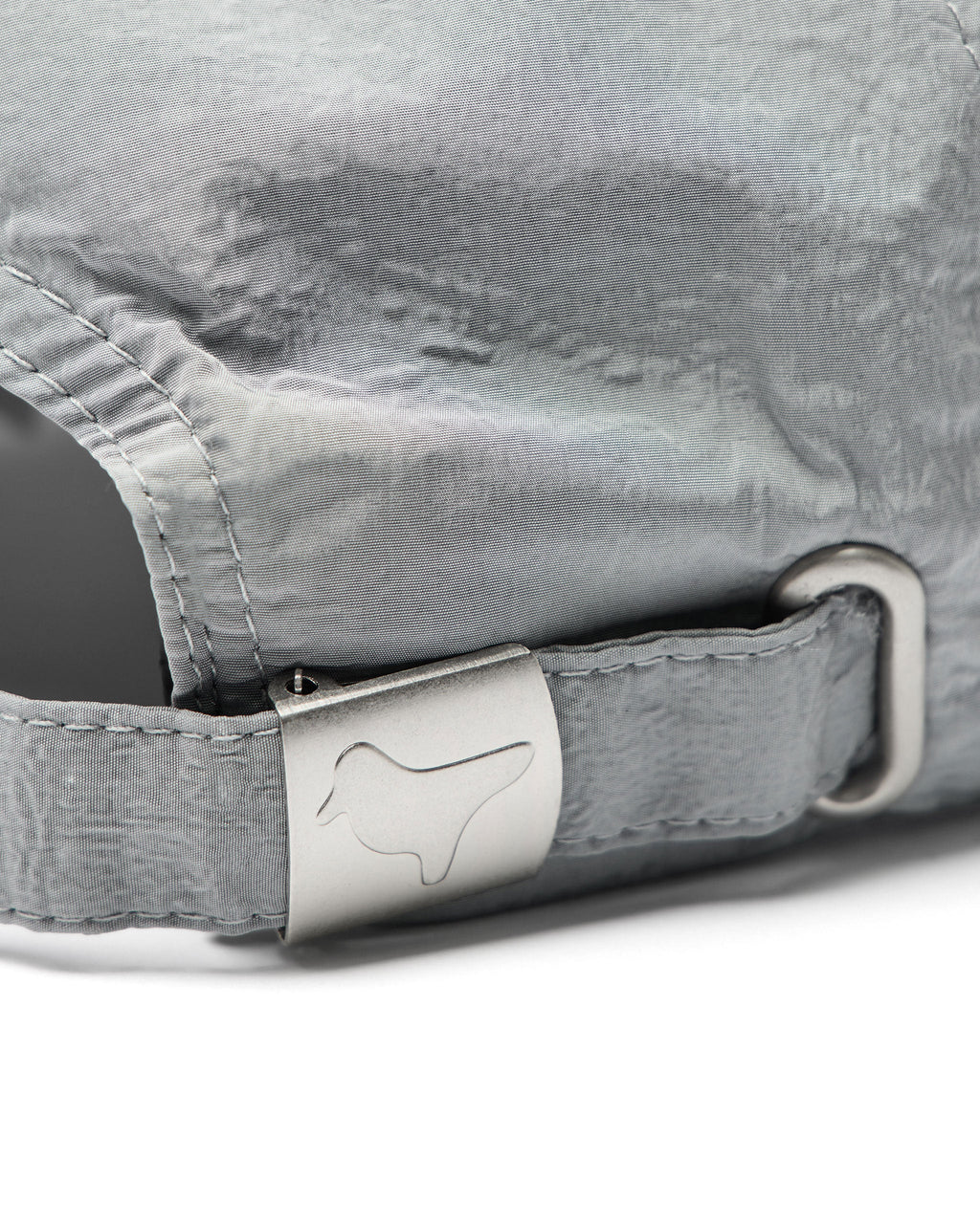 WO baseball cap made from lightweight high density woven 100% Nylon parachute style fabric with misted lightly reflective surface. Treated with an additional DWR (Durable Water Repellent) coating.
